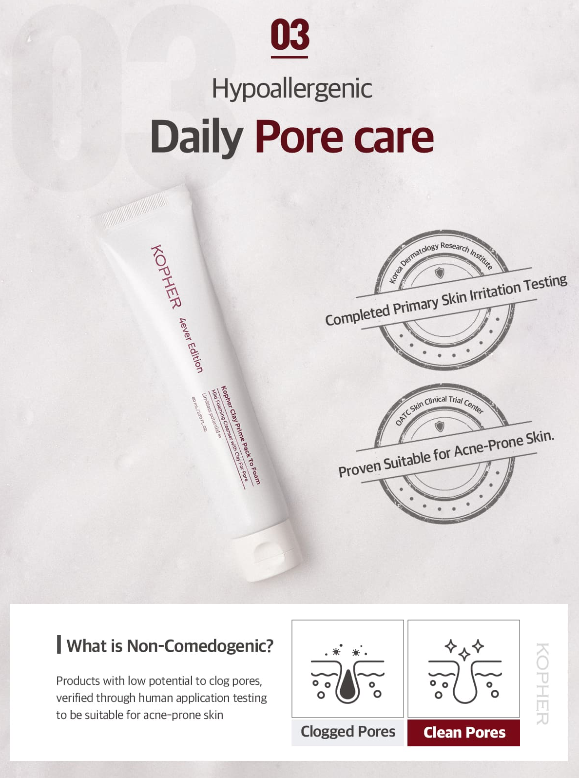 Kopher Clay Prime Pack To Foam is a 2 in 1 foam helps with oily skin, pores, and blemishes by removing blackheads and whiteheads in one use and tightening pores and smoothing skin instantly.