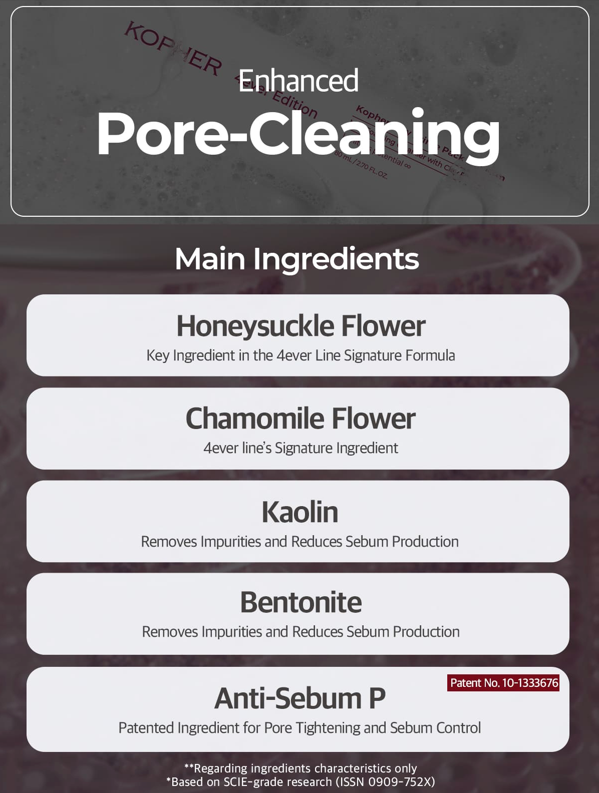 - Kaolin and Bentonite remove impurities and reduce sebum production, and Anti-Sebum P tightens the pores and controls sebum.